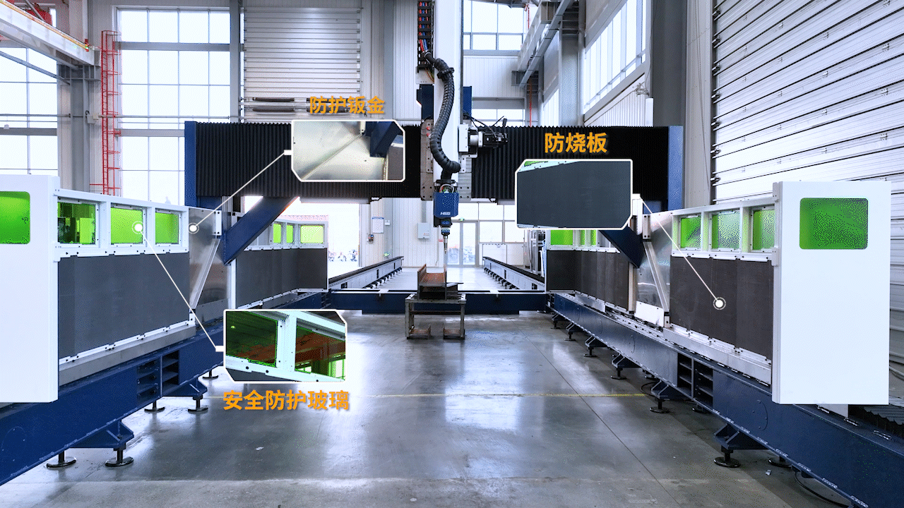 PR1500B激光切割機配備三重安全防護,橫梁兩側(cè)增加防護鈑金并覆蓋一層防燒板,防止切割熔渣飛濺,同時設(shè)備上設(shè)有安全防護玻璃,方便實時觀察切割動作,切實做到了安全穩(wěn)定生產(chǎn)。