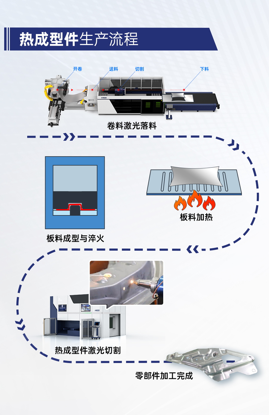 宏山激光GL系列卷料激光切割機(jī)搭配Cell系列三維五軸激光切割機(jī),可實(shí)現(xiàn)高強(qiáng)鋼料卷的自動(dòng)化落料、以及熱成型三維工件的高精度切割,從生產(chǎn)工序上助力實(shí)現(xiàn)輕量化目標(biāo)。