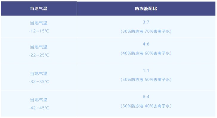 ● 使用濃度不能低于20%,不同氣溫有不同配比,請(qǐng)參考下表。如對(duì)配比有任何疑問,可咨詢我司售后服務(wù)熱線:400-8229-288 ;